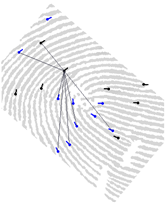 1.5.3. Математическая постановка задачиПреобразование относительных параметров к абсолютным параметрам компенсирует влияние параллельного переноса и поворота отпечатков пальцев при сканировании. Преобразование происходит для каждой обнаруженной минюции относительно всех остальных минюций на изображении На рис. 2.1 представлено изображение отпечатка пальца, с обнаруженными на нем минюциями. Линиями представлено относительное расположение точек относительно центральной. На рис. 2.2 представлено изображение отпечатка того же пальца, но повернутого относительного первого на 45 градусов. Линиями представлено относительное расположение точек относительно центральной. Прямой отпечаток