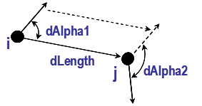 где i, j – минюции dLengthij – расстояние между точками i и j dAlpha1ij – угол между направлением точки i и направлением на точку j dAlpha2ij – угол между направлением точки i и точки j Alphai – угол вектора самой точки Alphaij – угол вектора направления от точки i к точке j На рис. 2.5 представлено расположение точки i относительно точки j со всеми полученными параметрами. относительные параметры