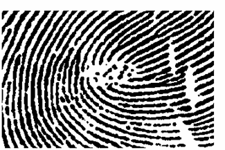 Рис. 2.10 1.12.2. Исходные данныеДля теста использовалось около 50 отпечатков разных людей и разного возраста. На рис. 2.11, 2.12, 2.13 приведены несколько изображений папиллярного узора, которые предполагается сравненить между собой и другими отпечаткаи в базе данных отпечатков. Данные изображения получены посредством зачернения пальца и приложения его к листу белой бумаги, после чего отпечатоки были отсканированы и сохранены в виде bmp файлов на компьютере. Полученные таким образом отпечатки имеют не высокое качество, поэтому можно полностью проверить все этапы работы программы. На рис. 2.11, 2.12 представлены отпечатки одного и тогоже пальца, а значит, в результате работы программы они должны совпасть. Рис. 2.13 это отпечаток другого пальца, нежели предыдущие три отпечатка. Подсистема распознавания в качестве входных параметров принимает результат работы подсистемы анализа изображения. На рис. 2.14 изображен обработанный отпечаток А1, на рис. 2.15 – А2, на рис. 2.16 – В Исходный образ A1