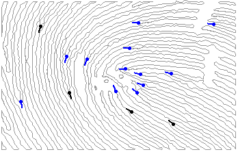 Рис. 1 Для сравнения на битовом образе находятся локальные особенности папиллярного узора – минюции. Для поиска минюций алгоритм производит обход по контуру гребней. РАЗРАБОТКА СИСТЕМЫ ИДЕНТИФИКАЦИИ ЛИЧНОСТИ ПО ОТПЕЧАТКАМ ПАЛЬЦЕВ 1.1. Обоснование целесообразности разработки системы идентификации личности по отпечаткам пальцев1.1.1. Назначение системыСистема идентификации личности по отпечаткам пальцев реализует определение личности на основе биометрических параметров, а именно отпечатков пальцев. Система предназначена для обработки графических изображений отпечатков. Система позволяет сравнить несколько отпечатков друг с другом по выделенным локальным особенностям – минюциям и их относительным параметрам (расположению одних минюций относительно всех остальных), что гарантирует независимость сравнения от параллельного переноса и вращения. Программный продукт найдет применение в различных прикладных системах, включая: 1) системы гражданской идентификации; 2) криминалистические системы идентификации; 3) крупномасштабные коммерческие приложения. Системы гражданской идентификации включают в себя: - водительские паспорта; - национальные идентификационные карты граждан; - регистрация избирателей; - регистрация для социальных программ; - иммиграционная регистрация, визы; - идентификация сотрудников государственных учреждений. Криминалистические системы идентификации включают в себя: - находится ли данный гражданин в розыске; - прежние судимости; - регистрация заключенных/контроль доступа; - мобильные и удаленные приложения; - обработка отпечатков пальцев, полученых с мест преступления; Крупномасштабные коммерческие приложения включают в себя: - доступ к Web-ресурсам, электронная коммерция; - доступ для пользователей и сотрудников; - финансовые сервисы, проверка оплаты; - доступ в здания и помещения; - программы лояльности; 1.1.2. Характеристика функциональной структуры системыФункциональная схема системы приведена на рис. 1.1. Обработка изображений состоит из следующих этапов: 1) ввод изображения в систему идентификации личности по отпеаткам пальцев; 2) в подсистеме анализа изображения происходит обработка растра с целью подавления шумов, а так же устранение типичных искажений изображения, таких как разрывы или слипания дуг папиллярного узора; 3) в подсистеме анализа изображения происходит выделение локальных особенностей, таких как окончание и раздвоение, для дальнейшего распознавания отпечатка; 4) в подсистеме распознавания происходит преобразование абсолютных параметров специальных точек к относительным параметрам для предотвращения влияния параллельного переноса и поворота пальца при сканировании отпечатка; 5) распознавание отпечатка по базе с существующими отпечатками происходит на основе относительных параметров каждой точки для каждого хранящегося в базе отпечатка. Функциональная схема системы идентификации личности по отпечаткам пальцев