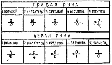Петлевые и дуговые узоры, все равно на каком бы пальце они не были, обозначаются — 0. Завитковые узоры обозначаются разными числами. Число, которое обозначает завитковый узор зависит от того, на каком пальце завитковый узор имеется; завитковый узор на любом из пальцев первой пары обозначается цифрой—16, на любом из пальцев второй пары— цифрой 8, на любом из пальцев третьей пары — цифрой 4, на любом из пальцев четвертой пары — цифрой 2 и на любом из пальцев пятой пары —цифрой 1. Кроме того, все 10 пальцев считаются в таком порядке: 1-й палец, это большой палец правой руки, 2-ой, это указательный палец правой руки, 3-й, это средний палец правой руки, 4-ый, это безымянный палец правой руки, 5-ый, это мизинец правой руки, 6-ой, это большой палец левой руки, 7-ой, это указательный левой руки, 8-й, это средний левой руки, 9-й, это безымянный левой руки и 10-й, это мизинец левой руки. Обозначения, которые даны завитковым узором, записываются в дробь. Причем, если номер пальца, на котором есть завитковый узор, имеет четную цифру, цифровое обозначение завиткового узора записывается в числитель дроби, а если номер имеет нечетную цифру, то в знаменатель дроби.