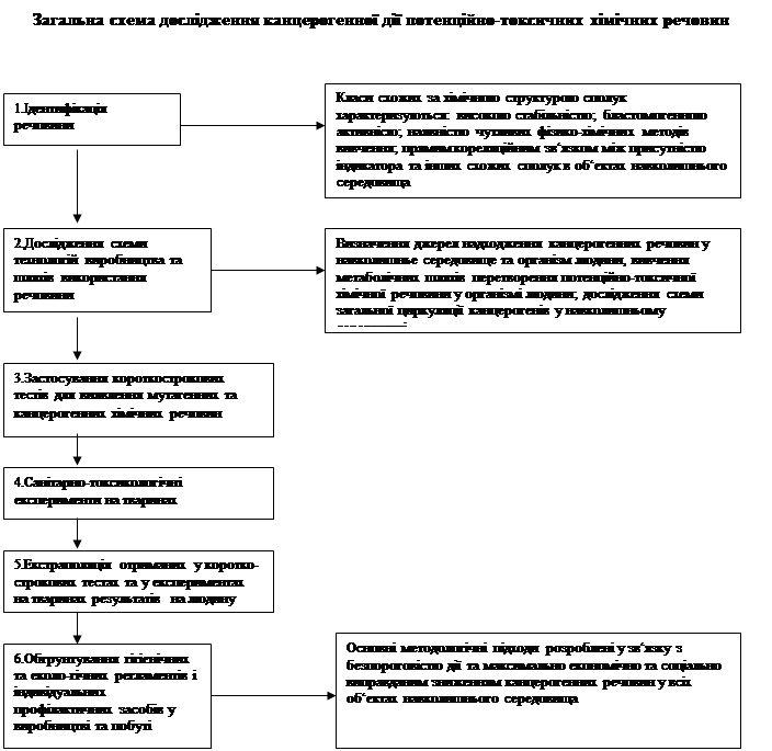 Вступ. Злоякісні новоутворення-одна з найважливіших медикобіологічних та соціально-економічних світових проблем. Щодо України, захворюваність та смертність від раку стабільно зростають, ризик їх збільшується у зв’язку з несприятливою екологічною та економічною ситуацією в країні та значним постарінням населення. Рак є причиною більше 15% усіх смертей в Україні, поступаючись лише смертності від серцево-судинних захворювань, 35% померлих від раку- особи працездатного віку. Вважають, що до 85-90% усіх випадків раку визначається впливом канцерогенів навколишнього середовища [27,20] : з них 70-80% пов’язують з хімічними (головним чином поліароматичними вуглеводнями-ПАВ та нітрозамінами НА) та 10% радіаційними факторами [6]. За таких умов виникає ситуація, коли людина намагається максимально захистити себе та свою спільноту від несприятливої дії канцерогенів навколишнього середовища. Так, завдяки стрімкому розвитку НТР, у світі щорічно з’являється 300 тис. нових сполук , які входять у наш побут, виробничі процеси, навколишнє середовище та т.ін. При цьому людина прагне виокремити з цієї маси канцерогенні сполуки та знизити їх вміст у оточуючому її середовищі до рівнів, що відповідають максимально можливим нешкідливим для неї та навколишнього середовища. На цьому фоні виникає потреба знаходження адекватних, швидких та порівняно недорогих шляхів виявлення хімічних речовин, що мають канцерогенні властивості; встановлення адекватних ГДК та ГДД для канцерогенних сполук, що будуть враховувати природно-кліматичні та промислово-економічні властивості відповідних регіонів; постають нові проблеми розгляду підходів до нормування хімічних забрудників навколишнього середовища з точки зору медичної екології; виникає необхідність вивчення сумарного навантаження на організм канцерогенних та неканцерогенних агентів навколишнього середовища і перед усе хімічних сполук, що модифікують процес канцерогенезу. На даний момент для України однією з найважливіших проблем у вирішенні питання професійного раку є створення методичних основ вивчення ролі умов праці, зокрема впливу на працююче населення канцерогенонебезпечних речовин та факторів, у виникненні злоякісних новоутворень, формуванні онкологічної захворюваності в Україні, вдосконалення критеріїв встановлення діагнозу "професійний рак" та системи заходів з первинної профілактики злоякісних новоутворень. Для цього необхідними є: 1. Розробка методичних основ виявлення та реєстрації професійно обумовлених злоякісних новоутворень. 2. Розроб ка методичних основ оцінки ролі умов праці як факторів ризику виникнення злоякісних пухлин. 3. Розробка системи заходів з первинної профілактики професійного раку. Втілення в практику цих завдань буде сприяти оздоровленню умов праці на онконебезпечних підприємствах, підвищенню рівня медичного забезпечення робітників онконебезпечних виробництв та професій, розробці адекватних управлінських рішень та заходів щодо зниження ризику виникнення та рівнів розповсюдження онкологічних захворювань серед населення. Розділ 1. Загальні уявлення про канцерогенну дію потенційно-токсичних хімічних речовин. 1.1.Канцерогенез. Канцерогени. Принципи класифікації канцерогенних речовин. Комітет експертів ВООЗ дав наступне визначення поняття “канцероген”. “