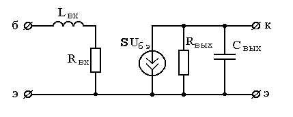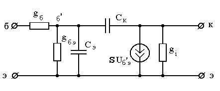 Рисунок 2.5 - Эквивалентная схема Джиаколетто 2). Однонаправленная модель [3] L вх =L э +L б =0,2+1=1,2 нГн R вх =r б =1,07 Ом R вых =R i =g i –1 =75,2 С вых =С к =5,1 пФ G 12ном =(f max /f тек )2 =(3060/200)2 =15,32 =234,09
