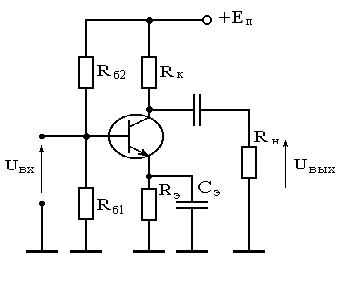 Рисунок 2.7 - Схема оконечного каскада с эмиттерной термостабилизацией Найдём необходимое Еп для данной схемы: Е п =UR э + U кэ0 + UR к =3+7+0=10 В. (2.17) Рассчитаем Rэ , Rб1 , Rб2 :