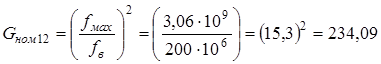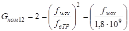 = Подставив в формулу (2.41) найденное значение максимальной частоты и верхнюю частоту заданной полосы, найдём усиление: