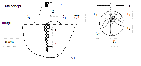 Рис.3.1.. Игла, которая введена в БАТ: 1-основная волна, 3-непарная гармоника Вдоль спирали распространяются поверхностные электромагнитные волны сложной структуры, их помечают символом Тп , где п -число длин волн, которые вмещаются на длине витка спирали 1. Если l=2πa<<λ, то имеет место волны типа Т0 . Режим, который отвечает вехе излучение при l≈λ , в спирали волна Т1 . Для синфазного составления полей в соседних витках должно выполняться соотношение: