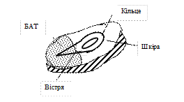 Рис. 3.2. Положение микроиглы при микроиглотерапии Значение диэлектрической проницаемости: 1. Подкожный слой - ε =30. 2. Мышци - ε =48. 3. Воздух - ε =1. 4.Вода- ε =80. Вместо кольца на поверхности БАТ можно размещать элементы бижутерии. Резонансная частота диэлектрического резонатора, которая имеет форму слоя, рассчитывается по формуле: