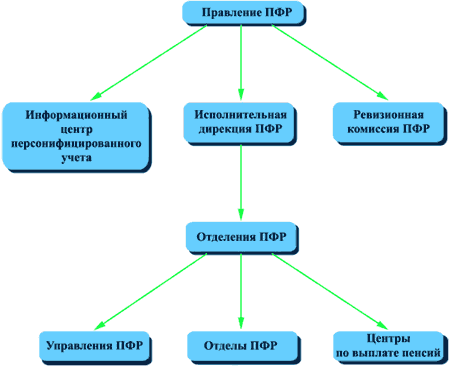 2. Организационная структура и его деятельность. Управление ПФР : Общее руководство Пенсионным фондом осуществляется Правлением, оперативное управление - исполнительной дирекцией. Органами оперативного управления в субъектах федерации являются отделения РФ, а в городах и районах - уполномоченные отделения. В состав Правления по должности входят председатель, первый заместитель, а также управляющие отделениями фонда. В состав Правления могут также входить представители общественных, религиозных и государственных организаций, объединений, учреждений и предприятий, деятельность которых связана с защитой интересов пенсионеров, инвалидов и детей. В работе Правления ПФР могут принимать участие с правом совещательного голоса управляющие отделениями ПФР по республикам в составе РФ, руководители министерств и ведомств РФ, Банка России. На Правление фонда возлагается ответственность за выполнение функций, относящихся к компетенции ПФР, определение перспективных и текущих задач фонда, составление бюджета ПФР, отчета о его исполнении и сметы расходов на очередной год, а также утверждение структуры ПФР. Кроме того, правление ПФР назначает и освобождает от должности исполнительного директора и его заместителей, председателя ревизионной комиссии ЛФР и руководителей его отделений, издает в пределах своей компетенции нормативные акты, а также решает другие вопросы, относящиеся к его компетенции. Сбор и перераспределение средств ПФ проходит по следующему маршруту: страховые взносы собираются на счетах отделений, откуда и осуществляется финансирование расходов в регионе. На федеральном уровне Правление ПФ и его исполнительная дирекция прогнозируют и устанавливают объемы перераспределения средств между регионами для сбалансированности доходов и расходов с учетом обеспечения минимальной суммы оборотных средств и оптимизации сумм в пути (а это зависит от скорости прохождения платежей и географического положения региона-донора и региона-реципиента). В большинстве субъектов РФ назначение и выплата пенсий производятся органами социальной защиты населения, которые средства ПФР доводят до пенсионеров через отделения федеральной почтовой связи или путем перевода на счета пенсионеров, открытых в основном в филиалах Сбербанка РФ. В семи субъектах РФ в порядке эксперимента организована единая пенсионная служба, где и назначение и выплата пенсий проводятся отделениями Пенсионного фонда.