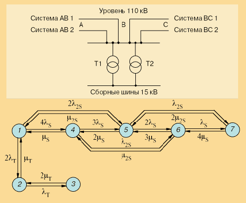 На базе графов состояний и переходов от одного состояния к другому можно составить систему дифференциальных уравнений, при помощи которой с использованием приведенных ранее величин времени выхода из строя и максимальной продолжительности восстановления отказавших линий 110кВ и трансформаторов вычисляется длительность нахождения в нерабочем состоянии (эксплуатационная неготовность) этих компонентов системы электроснабжения. Она составляет 0,07мин/год. Если при прочих равных условиях подстанция подключена к системе 110кВ как тупиковая и в то же время имеет упрощенное блочное исполнение, то при тех же значениях продолжительности ремонта длительность нахождения вне эксплуатации составит 4,4мин/год; при минимальных значениях продолжительности ремонтов этот показатель уменьшается до 2,6 мин/год. Расчетные значения достаточно близко совпадают с результатами, полученными при обработке статистических данных. 1.1.1. Передача электроэнергии Электроэнергия, вырабатываемая генератором, отводится к повышающему трансформатору по массивным жестким медным или алюминиевым проводникам, называемым шинами. Шина каждой из трех фаз изолируется в отдельной металлической оболочке, которая иногда заполняется изолирующим элегазом (гексафторидом серы). Трансформаторы повышают напряжение до значений, необходимых для эффективной передачи электроэнергии на большие расстояния. Генераторы, трансформаторы и шины соединены между собой через отключающие аппараты высокого напряжения – ручные и автоматические выключатели, позволяющие изолировать оборудование для ремонта или замены и защищающие его от токов короткого замыкания. Защита от токов короткого замыкания обеспечивается автоматическими выключателями. В масляных выключателях дуга, возникающая при размыкании контактов, гасится в масле. В воздушных выключателях дуга выдувается сжатым воздухом или применяется «магнитное дутье». В новейших выключателях для гашения дуги используются изолирующие свойства элегаза. Для ограничения силы токов короткого замыкания, которые могут возникать при авариях на ЛЭП, применяются электрические реакторы. Реактор представляет собой катушку индуктивности с несколькими витками массивного проводника, включаемую последовательно между источником тока и нагрузкой. Он понижает силу тока до уровня, допустимого для автоматического выключателя. С экономической точки зрения, наиболее целесообразным, на первый взгляд, представляется открытое расположение большей части высоковольтных шин и высоковольтного оборудования электростанции. Тем не менее все чаще применяется оборудование в металлических кожухах с элегазовой изоляцией. Такое оборудование необычайно компактно и занимает в 20 раз меньше места, нежели эквивалентное открытое. Это преимущество весьма существенно в тех случаях, когда велика стоимость земельного участка или когда требуется нарастить мощность существующего закрытого распредустройства. Кроме того, более надежная защита желательна там, где оборудование может быть повреждено из-за сильной загрязненности воздуха. Для передачи электроэнергии на расстояние используются воздушные и кабельные линии электропередачи, которые вместе с электрическими подстанциями образуют электросети. Неизолированные провода воздушных ЛЭП подвешив