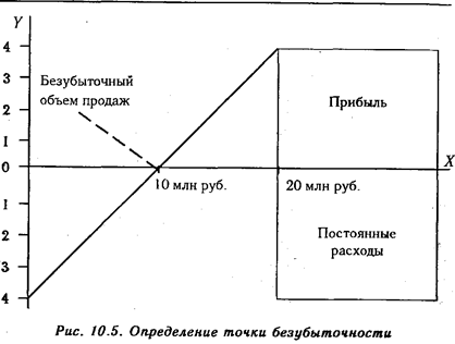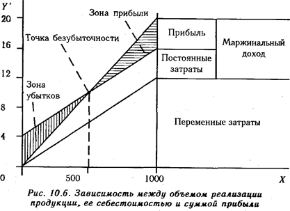 График (рис. 10.6) позволяет также определить маржинальный доход как разность между выручкой от реализации продукции и переменными затратами: