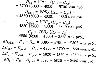 Затем следует определить сумму прибыли при фактическом объеме и структуре реализованной продукции, но при плановой себестоимости и плановых ценах. Для этого необходимо от условной выручки вычесть условную сумму затрат: . Прибыль при таких условиях составит 18 278 млн руб. (96 600 - 78 322).