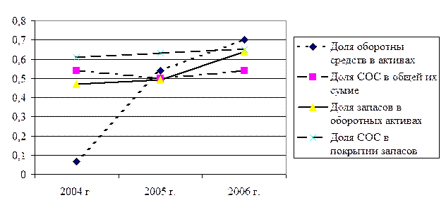 Анализ данных таблицы 7 показал, что на исследуемом предприятии в 2006 г. по сравнению с 2004 г. произошло увеличение доли оборотных активов с 0,65 до 0,7. В 2005 г. по сравнению с 2004 г. произошло увеличение доли запасов в оборотных активов с 0,47 до 0,49. Анализ оборотов запасов показал, что в 2004 г. оборачиваемость запасов ОАО «Электроаппарат» составляла 73 дней, в 2005 г. произошло уменьшение данного показателя до 70 дней, что является положительным моментом, но в 2006 г. оборачиваемость запасов вновь возросла до 74 дней. Количество оборотов запасов в год в 2006 г. было максимально и достигало 5,34 оборота. Продолжительность операционного цикла предприятия в 2004 – 2006 гг. была равна соответственно 100, 98, 100 дней. Длительность финансового цикла ОАО «Электроаппарат» в 2005 г. уменьшилась до 69 дней. Коэффициент погашаемости дебиторской задолженности в 2006 г. по сравнению с 2004 г. увеличился с 0,078 до 0,079 (в 2005 г. – 0,072), что является положительным моментом. Изобразим данные таблицы 7 на рис.3 .