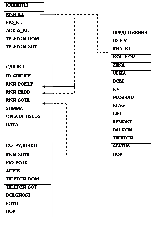 Рис.1 - Инфологическая модель предметной области 1.2. Проектные решения по информационному обеспечению Любая автоматизированная система предполагает наличие в своем составе подсистемы информационного обеспечения, питающая другие подсистемы данными, на основе которых осуществляется принятие решений, включая их оптимизацию с использованием математических методов и ЭВМ. Для проектирования будет использована реляционная модель данных, так как в реляционной модели достигается гораздо более высокий уровень абстракции данных, чем в иерархической или сетевой модели. Предсказуемость результатов работы с данными обеспечивается математической моделью данных, которая лежит в основе реляционной модели. Любой запрос, составленный на конкретном языке, влечет ответ, однозначно определенный схемой данных и конкретными данными. Выбранная предметная область достаточно естественно описывается в терминах отношений, нет излишнего дублирования записей. Модель наглядна и при необходимости можно осуществить доступ к данным любого уровня. На основании вышеизложенного можно сделать вывод, наиболее эффективной моделью данных для отображения выбранной предметной области и реализации запросов пользователя является реляционная модель. 1.3. Проектные решения по программному обеспечению Программное обеспечение должно соответствовать стандартам Windows. Программное приложение должно позволять формировать запросы к данным с помощью простых визуальных средств настройки, должно организовывать возможность быстро находить нужную запись, если известно только содержание нескольких полей, с целью сокращение затрат времени пользователя. Программное приложение должно поддерживать русский интерфейс, быть приложением Windows. Данная разработка должна соответствовать следующим требованиям: - защита информации от несанкционированного доступа; - оперативность информационного обмена и управления; - рациональная организация информационных фондов; - квалификация специалистов, участвующих в процедурах обработки информации. Приложение должно включать в себя дружественный интерфейс, который подразумевает под собой всплывающие подсказки, и справки доступные пользователю во время работы с приложением. 2. Разработка автоматизации рынка недвижимости 2.1. Информационное обеспечение комплекса задач 2.1.1. Инфологическая модель, схема данных и ее описание Для проектирования схемы данных, необходимо привести отношения к 3НФ необходимо провести анализ функциональных зависимостей между атрибутами в пределах каждого отношения. 1. Сотрудники: (RNN _ SOTR , FIO_SOTR, ADRES_SOTR, TELEFON_DOM, TELEFON_SOT, DOLGNOST, FOTO, DOP). Учет сотрудников ведется с помощью РНН сотрудника. Атрибут RNN_SOTR – уникален и является первичным ключом. Все атрибуты являются атомарными, следовательно, отношения находятся в 1НФ. Первичный ключ – простой и функциональная зависимость всех не ключевых атрибутов от первичного ключа – полная, следовательно, отношения находятся во 2НФ. Все неключевые атрибуты функционально зависят от первичного ключа, других функциональных зависимостей нет, следовательно, отношения находятся в 3НФ. 2. Клиенты: (RNN_KL , FIO_KL, ADRES_KL, TELEFON_DOM, TELEFON_SOT). Учет клиентов ведется с помощью РНН клиентов. Атрибут RNN_KL – уникален и является первичным ключом. Все атрибуты являются атомарными, следовательно, отно