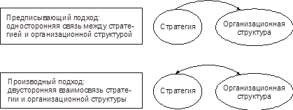 Рис. 1. Два подхода к стратегии и организационной структуре Как утверждают некоторые специалисты, в рамках предписывающего подхода компания сначала разрабатывает стратегию, а затем определяет соответствующую организационную структуру. С точки зрения стратега, придерживающегося предписывающего подхода, организационная структура определяется тем, как будет реализовываться стратегия, она не оказывает влияния на стратегию как таковую. Другая позиция такова, что сначала следует выработать стратегию, а затем организация должна продумать соответствующую структуру, способствующую реализации уже утвержденной стратегии. С позиций производного подхода стратегия организации и ее структура находятся в более тесном взаимодействии, поэтому в процессе разработки стратегии следует учитывать структуру организации. При рассмотрении изменений оргструктуры следует учитывать, что она отражает взаимосвязи, складывающиеся между подразделениями организации и направленные на выполнение миссии и достижение поставленных целей. Структура управления во многом определяется на основе схем коммуникаций и распределения полномочий. Стратегические менеджеры должны решить, какие изменения в организационной структуре и кадровые перемещения необходимо сделать в целях успешной реализации стратегии. • Следует ли объединить отдельные виды деятельности в группы? • Должны ли решения приниматься централизованно руководством или децентрализовано (управляющими на местах)? • Должна ли организация иметь жесткое управление (с множеством правил и проверок)? • Целесообразно ли построение многоуровневой организационной структуры с узким интервалом управления или «плоской» структуры – с меньшим числом уровней управления, каждый из которых имеет широкую сферу контроля. Централизованная функциональная структура эффективна при ограниченном ассортименте производимой продукции. По мере изменения масштаба производства, приобретения собственных источников сырья и (или) сетей распределения сверхцентрализованные структуры управления перестают соответствовать новым условиям. Диверсифицированные компании вынуждены переходить к децентрализованной структуре управления с выделением самостоятельных хозяйственных предприятий. Следует обратить внимание, что выбор той или иной организационной структуры зависит от целого ряда факторов, наиболее значимыми из которых являются: • размер и степень разнообразия деятельности, присущие организации; • географическое размещение организации; • технология; • динамизм внешней среды; • стратегия, реализуемая предприятием. Необходимо отметить важность процедуры отбора исполнителей на ключевые позиции. Одна из первых задач реализации стратегии – собрать вместе сильную управленческую команду, состоящую из правильно подобранных людей и обладающую необходимыми навыками и мастерством. В условиях быстро изменяющейся и развивающейся ситуации в тех случаях, когда у компании нет сотрудников, обладающих требуемыми знаниями, опытом и управленческим ноу-хау, привлечение на ключевые руководящие посты специалистов со стороны представляет собой достаточно стандартный, обычный подход к построению организации. Для того чтобы подобрать дееспособную управленческую команду, нужно обладать определенным талан