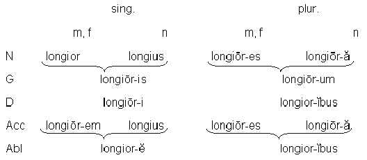 longus, a, um длинный ; G. sing. long-i; основа long- . Сравнительная степень: m - long - ior , f - long - ior , n - long - ius ; brevis, e краткий ; G. sing. brev-is , основа brev- . Сравнительная степень: m - brev - ior , f - brev - ior , n - brev - ius . Сравнительная степень изменяется по III согласному склонению: