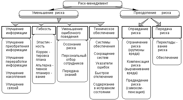 2.3. Риск при принятии решений Под риском понимается опасность ошибочного решения. Поскольку риск - опасность потерь, он означает негативное отклонение от цели. Так как будущее никогда неизвестно, все решения связаны с риском. Риск может заключаться во влиянии на рентабельность, доходы, затраты, оборот и ликвидность (возможность всегда оплачивать свои счета). Можно различать риск: - общий (угрожает предприятию как целому); - специальный по фактору (сырьевой, энергии, персоналу, капиталу); - специальный при изготовлении продукции (брак, не те способы, в НИОКР, в хранении); - специальный при оценке продукции (при сбыте, в цехах, в гарантиях, в оплате). Риск можно подразделить на калькулируемый и не калькулируемый, страхуемый и нет. Для влияния на все виды риска у менеджера имеется определенный инструментарий (рис. 4).