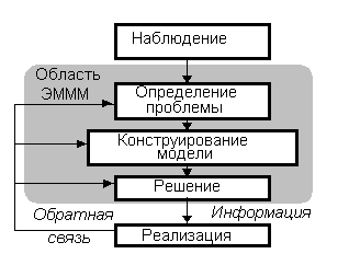 2.4. Математический инструментарий принятия решения Этот инструментарий (экономико-математические модели и методы - ЭМММ) представляет собой логический системный подход к решению проблемы управления. Схематически его можно изобразить, как это показано на рис. 5. С точки зрения ЭМММ центральным моментом становится конструирование модели - абстрактного представления существующей проблемной ситуации. Обычно такая модель представляется в виде математического соотношения или графика.