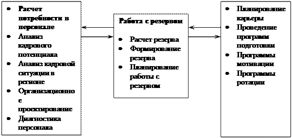 Рис. 3. Взаимосвязь кадрового менеджмента и направлений работы с резервом Группа кандидатов на замещение вакантной должности формируется на основе объявления открытого конкурса и из электронного банка резерва кадров, включающего в себя лиц, занимающих подобную должность или квалифицированных специалистов, подходящим по профессиональным и личностным качествам, работающих во всех филиалах компании. Соответственно, оценка кандидатов проводится с целью определить наиболее подходящего для занятия вакантной должности. Данные оценки каждого кандидата заносятся в его личное дело, в котором учитываются профессиональное образование, пройденные курсы подготовки и переподготовки, результаты аттестации и оценки, занимаемые должности, а также рекомендации к дальнейшему карьерному продвижению. В результате оценки группы кандидатов выявляется наиболее подходящий претендент, при необходимости для него формируется индивидуальный план развития, а также программы групповой подготовки, принимаются решения о зачислении его в резерв по новым должностям, повышение или ротацию. Особое значение уделяется определению соответствия психограмме, отражающей профессионально значимые социально-психологические, интеллектуальные и деловые качества выдвиженца. Вместе с тем, профессиограмма, регламентирующая профессиональные требования, не фиксирует собственно должностные функции, возлагаемые на конкретных должностных лиц и, соответственно, не может быть единственным критерием отбора. Дополнительным уточняющим фактором является должностная инструкция. Поскольку в каждой организационной структуре на одно и тоже должностное лицо возлагаются различные функции, требующие от конкретного специалиста дополнительной компетентности в самых различных сферах деятельности, возникает необходимость отследить и проанализировать эти дополнительные компетенции. Именно поэтому должностная инструкция не носит формально-абстрактный характер, а отражает реальные задачи и функции, возлагаемые на конкретное должностное лицо. Кадровый резерв чаще всего формируется путем опроса руководителей подразделений. Каждый руководитель подразделения в компании в начале года определяет потребность в кадрах и рекомендует людей на замещение вакансий, главным образом, по управленческим позициям. Программа обучения кадрового резерва также составляется вместе с руководителями подразделений. В организации популярна и традиционная ротация кадров, что непосредственно влияет на совершенствование сотрудников и подготовку их к возможному плановому и внеплановому назначению на освободившуюся или вновь появившуюся вакансию. Главный мотив, заставляющий составлять планы кадрового резерва — расширение деятельности компании и создание региональных представительств. Например, менеджер по персоналу «Megaline» рассказала, что планирование кадрового резерва у них в компании связано, прежде всего, с разработкой программы о расширении зоны покрытия Интернет-ресурсами во всех районах города. До конца 2010 года завершить программу. В составе кадрового резерва числится около 10% от полного штатного состава сотрудников. Коэффициент готовности к замещению, по полученным мною данным, равен примерно 2,5% (то есть 5 резервистов на 2 должности), тогда как по западным стандарт