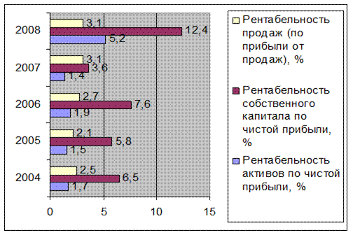 Рисунок 6. Динамика показателей рентабельности Таким образом, приведенные данные свидетельствуют о положительной динамике практически всех основных технико-экономических показателей ЗАО «Агрофирма Оптина» за анализируемый период. В дальнейшем организация будет поддерживать стратегию увеличения прибыли за счет увеличения товарооборота, а также снижения затрат связанных с реализацией продукции. Данные бухгалтерской отчетности позволяют получить обобщенную оценку финансового состояния организации, анализ которого является важнейшим элементом успешной организации бизнеса и повышения эффективности его функционирования с помощью рациональной финансовой политики. Внешним проявлением финансовой устойчивости выступает платежеспособность. На практике платежеспособность предприятия выражается через ликвидность его баланса. Проведем анализ ликвидности ЗАО «Агрофирма Оптина» за отчетный период при помощи финансовых коэффициентов (таблица 4). Из расчетов, представленных в табл. 2.4, следует, что на начало отчетного периода ЗАО «Агрофирма Оптина» за счет имеющихся денежных средств (краткосрочные финансовые вложения отсутствуют) в состоянии было погасить только 1,3% своих краткосрочных обязательств, а на конец 2008 г. — 4,7%. Вместе с тем если организация получит деньги от дебиторов, то на конец отчетного периода она сможет расплатиться уже с 60,6% своих долгов (коэффициент критической ликвидности на конец 2008 г. составил 0,606). Таблица 2.4 Показатели, характеризующие платежеспособность ЗАО «Агрофирма Оптина»
