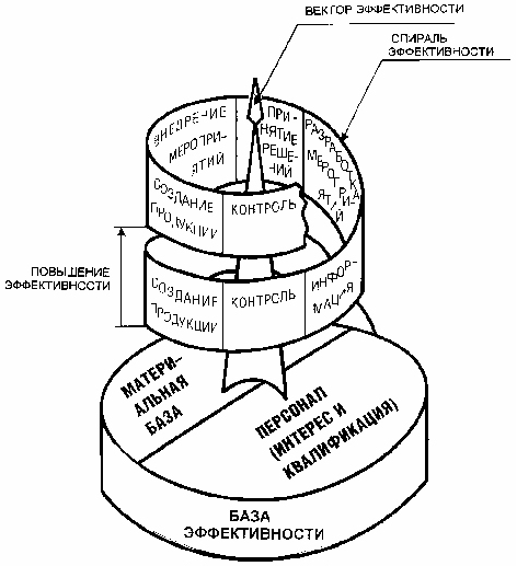 Рис. 4. Модель эффективности предприятия Смысл представленной модели заключается в следующем: материальная база предприятия и персонал определяют основные условия производства и служат «базой эффективности». Если предприятие имеет хорошую материальную базу и квалифицированный персонал, заинтересованный в результатах своего труда, это означает, что имеется благоприятная основа (база) для эффективного производства. Наличие такой базы положительно влияет на процесс управления. Условно это изображено на модели в виде «вектора эффективности», который превращает плоскую петлю оперативного управления (рис.3) в восходящую спираль с повышением эффективности производства после каждого цикла управления. Естественно, что сам процесс оперативного управления предприятием должен представлять собой непрерывную последовательность логически связанных функций: контроль, информация, разработка мероприятий, принятие решений и внедрение мероприятий. Если же на предприятии нет необходимой материальной базы или работники не заинтересованы в высоких результатах своего труда, это означает, что нет той основы, которая требуется для обеспечения эффективной работы предприятия. На модели это будет означать, что вектор эффективности равен нулю и восходящая спираль превратится в плоскую петлю, т.е. управление предприятием будет проходить без повышения эффективности производства. Подводя итог сказанному о структуре и принципах менеджмента, можно сделать следующие выводы. Управление (руководство) предприятием включает в себя организацию работ (построение структуры и создание системы управления) и текущее управление, представляющее собой непрерывный процесс, состоящий из последовательности логически связанных управленческих функций. Хорошая материальная база, квалифицированный и заинтересованный персонал и четкое управление предприятием представляют собой три тесно связанных между собой фактора, которые необходимы для успешной деятельности предприятия. Основой эффективной деятельности предприятия является его материальная база и персонал, а ключевым фактором — мотивация персонала. Первый принцип эффективности управления состоит в том, чтобы оно было направлено на создание современной материальной базы и на формирование квалифицированного и заинтересованного персонала, причем в первую очередь оно должно быть направлено на мотивацию персонала. Второй принцип эффективности управления состоит в организации работ, при которой структура соответствует внешней среде, технологии, стратегии и размеру предприятия, а система управления позволяет оперативно и гибко реагировать на складывающуюся ситуацию. Третий принцип эффективного управления заключается в выполнении управленческих функций с применением известных в менеджменте и подходящих к данной ситуации школ и методов управления в процессе текущего управления предприятием. При этом особое внимание необходимо уделить системному и ситуационному подходам для учета влияния внутренних и внешних факторов на деятельность предприятия. Надеюсь, что изложенное в настоящей статье одно из возможных представлений о структуре и принципах менеджмента будет полезным для уяснения сущности и условий эффективного управления предприятием. В любом случае буду признателен, если с