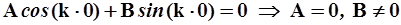 3.1.4. Общее решение уравнения еще не является волновой функцией. Для того, чтобы такое превращение произошло, необходимо проверить совместимость полученного решения со всеми требованиями, предъявляемыми к волновой функции, и привести его в соответствие с ними: требованию неразрывности удовлетворяют обе тригонометрические составляющие и общее решение – также; требованию конечности решение тоже удовлетворяет, поскольку оно не может превышать величину (А+В) и не может быть меньше, чем –(А+В) . Это связано с тем, что функции sin ( x ) и cos ( x ) изменяются в пределах –1 до 1; однозначности решения (3.9) нет, пока не определена точка отсчета. Поэтому введем граничные условия, а именно: