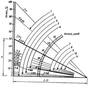 Прибор имеет опорную рейку 8 и прикрепленную к ней рамку 7. В углу рейки между двумя планками 4 находится латунная ось 3, к которой подвешен маятник 5. Маятник сделан из двух проволочных колец 2, припаянных к стальной пластинке 1, груза 11 и указателя 10. Груз перемещается между двумя направляющими 6 с полукруглыми вырезами. На внутренней стороне выреза одной из направляющих наклеена шкала 9 с делениями (цена деления 1°). Если опорная рейка находится в горизонтальном положении, указатель должен совпадать с нулевой отметкой шкалы. Для определения уклона крыши опорную рейку уклономера устанавливают на обрешетке перпендикулярно коньку, сторону рамы уклономера с маятником направляют в сторону конька крыши и на шкале указатель маятника покажет уклон в градусах. В зависимости от уклона крыши применяют определенный кровельный материал и устраивают необходимое для данного уклона число слоев (рис. 3). Кровельные материалы по технико-экономическим и физическим свойствам объединены в группы 1...11, которые на графике обозначены дугообразными стрелками. Наклонные линии обозначают уклон ската. Жирная наклонная линия на графике показывает отношение высоты конька h к половине ее заложения l/2. Отношение 1:2 (приведено в верхней части наклонной линии) показывает, что вертикальный отрезок h укладывается на горизонтальном отрезке l/2 два раза. На полукруглой шкале эта наклонная линия показывает уклон крыши в градусах, а на вертикальной — в процентах. Подобным образом по графику можно определить наименьший уклон для той или иной группы рекомендуемых кровельных материалов.