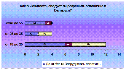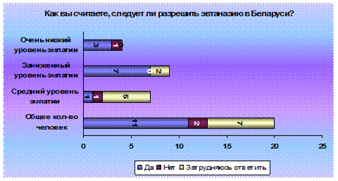 ЗАКЛЮЧЕНИЕ В данной курсовой работе мной был произведен анализ литературных источников по проблеме эвтаназии. Уже на этапе теоретического ознакомления с данным вопросом стало очевидным, что он крайне сложный и неоднозначный. В ходе эмпирического исследования мной была произведена следующая работа: исследование уровня эмпатических способностей у двадцати респондентов различного возраста и пола, разработана авторская анкета раскрывающая основные моменты эвтаназии. Произведен поиск корреляции уровня эмпатических способностей и отношения к эвтаназии. В рабочей гипотезе предполагалось, что такая зависимость существует. Анализирую ответы респондентов двух групп: мужчин и женщин можно заметить закономерность. Мужчины чаще, чем женщины высказывались в целом за эвтаназию, среди них оказался больший процент тех, кто считает допустимой активную эвтаназию. Любопытен тот факт, что среди мужчин не нашлось ни одного респондента который допускал бы пассивную, но отрицал активную эвтаназию. Самыми спорными оказались следующие вопросы: если бы близкий вам человек был бы неизлечимо болен, сильно страдал и просил вас о помощи, приняли бы вы решение об эвтаназии; совместимо ли явление эвтаназии с основными заповедями религии? Большинство и мужчин и женщин затруднилось ответить на них. По возрастным показателям все респонденты были разделены на три группы: 18-25 лет, 25-35 лет и 40-55 лет. Анализ ответов респондентов каждой группы дал следующие наблюдения. Опрашиваемые двух групп: 25-35 лет зачастую имели схожие ответы в процентном соотношении. Можно говорить об однородности ответов среди двух этих групп, так как существенных различий не было выявлено. Нельзя упустить тот факт, что первая возрастная группа (18-25 лет) чаше, чем другие две группы высказывалась в целом за эвтаназию. И, напротив, в возрасте от 25 до 55 лет люди чаще затруднялись ответить на вопросы об эвтаназии. Уровень эмпатических способностей был изучен при помощи методики В. В. Бойко. Среди данной выборки не оказалось респондентов с высоким уровнем эмпатических способностей. Поэтому все респонденты разделились на три группы: людей со средним уровнем эмпатических способностей, заниженным и очень низким уровнем. Анализируя ответы каждой группы опрашиваемых можно сказать что люди со средним уровнем эмпатии в своем большинстве затруднились высказать свое отношение к эвтаназии. Группы с заниженным и очень низким показателем в процентном соотношении высказались в большинстве за эвтаназию. Меньшая половина из двух этих групп затруднилась ответить на этот вопрос. Активную эвтаназию в большинстве своем допускают люди с заниженным и очень низким уровнем эмпатии. Опрашиваемые со средним уровнем значительно реже высказывались за активную эвтаназию. Подавляющее большинство опрашиваемых с заниженным и очень низким уровнем эмпатии высказались за то, что эвтаназию следует разрешить в Беларуси. Респонденты же со средним уровнем в большинстве затруднились ответить на данный вопрос. Самым неоднозначным вопросом оказался шестой, в котором респондентам предлагалось сделать следующий выбор: если бы близкий вам человек был бы неизлечимо болен, сильно страдал и просил вас о помощи, приняли бы вы решение об эвтаназии. Утвердительно ответило на данный вопрос половина респондентов двух г