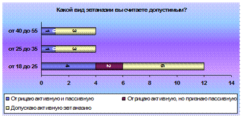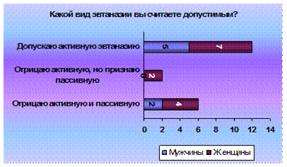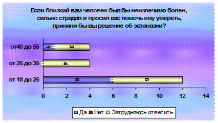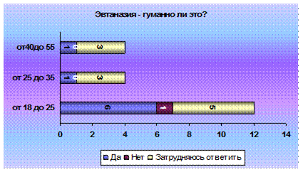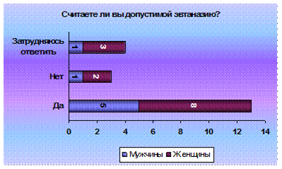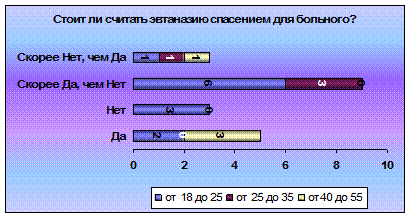 2 ЭМПИРИЧЕСКОЕ ИССЛЕДОВАНИЕ ОТНОШЕНИЯ К ЭВТАНАЗИИ 2.1. Обьект и предмет По нашим привычным верования и убеждениям жизнь – это хорошо, а смерть – плохо. Но что, если поменять все местами? Смерть – это хорошо, а жизнь – плохо? И дело не в отношении человека к смерти, не в гуманности и милосердии, или клятве Гиппократа, а в наших устоях и традициях. В том, к чему мы привыкли, в том, что весь мир испокон веку делится на черное и белое. И если бы, изначально, нам бы преподнесли эвтаназию как меру необходимости, то мы бы безоговорочно ее принимали. Но наш мир устроен иначе. И два противоположных лагеря годами бьются над разрешением или запретом эвтаназии. Тот же самый спор возникает при разрешении или запрете смертной казни. Гуманнее отменить или все-таки для особенных случаев разрешить?! Каждое государство делает выбор, руководствуясь какими-то своими политическими, этическими или иными принципами. Но как бы государство не поступило, в умах людей вопрос по разрешению или запрете эвтаназии будет вечен. Не зря когда то один мудрец сказал: «Сколько людей, столько и мнений». Право человека на жизнь и достойное существование - одно из важнейших, составляющих комплекс основных или «естественных» прав. Раз существует подобное право, то закономерно, что встает вопрос о возможности существования «права на достойную смерть». Но оно не освобождает от закона об охране жизни. «Существует право умереть достойно, по-человечески, без лишних страданий. Здесь идет речь об уважении человеческого достоинства... Смерть - это часть человеческой реальности со всеми ее последствиями и унижениями. Убегать от этого - означает быть трусом. Право на достойную смерть включает также право на лечение при помощи гуманных методов: они должны быть направлены на то, чтобы облегчить страдания и уныние, помочь умереть спокойно, без ненужной и бесконечной борьбы. Такое гуманное лечение всегда заканчивается лишь естественной смертью, без искусственной ее провокации. Это значит, что прибегать к искусственным методам, которые лишь замедляют процесс умирания, нужно продуманно и в соответствии с их целесообразностью. Все должно решаться с учетом, прежде всего, интересов самого больного». В последнее время все чаще и чаще звучит слово «эвтаназия». Разгораются жаркие споры о ее легализации в различных странах. Итак, что же это такое? В переводе с греческого это значит «благая смерть». По определению голландского законодательства эвтаназией называется «всякое действие, направленное на то, чтобы положить конец жизни той или иной личности, идя навстречу ее собственному желанию, и выполненное незаинтересованным лицом». Декларация об эвтаназии от 5 мая 1980 года окончательно разъясняет смысл эвтаназии: «Под словом эвтаназия подразумевается всякое действие или, наоборот, бездействие, которое, по своей сути или намерению, приводит к смерти, имеющей целью устранение боли и страдания». Получается, что эвтаназия - это преднамеренное убийство при помощи метода, провоцирующего наименьшие боль и страдания, совершенное «из жалости» для того, чтобы положить конец невыносимым страданиям, избавить от мук неизлечимо больного человека. Эта проблема уходит своими корнями в глубокое прошлое. Известен факт того, что в Спарте убивали младенцев, родившихся слабыми, больными. Также в некоторых перво