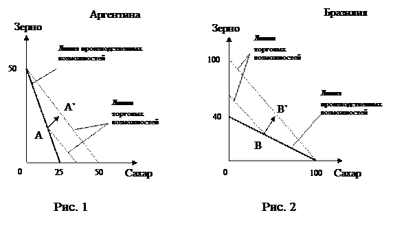 В условиях, когда внешняя торговля отсутствует, каждая страна может потреблять только те товары и только то их количество, которое она производит, а относительные цены этих товаров на внутреннем рынке определяются относительными издержками их производства. В нашем примере эти цены составят: 1 т зерна = 0,5 т сахара в Аргентине и 1 т зерна = 2,5 т сахара в Бразилии. Относительные цены на одни и те же товары в разных странах всегда различны (в результате различий в обеспеченности факторами производства, в используемых технологиях, квалификации рабочей силы и т.д.). Если эта разница превышает затраты на транспортировку товаров из страны в страну, то имеется возможность получать прибыль от внешней торговли. Так, в нашем примере производитель зерна в Аргентине при реализации его на внутреннем рынке может в обмен на 1 т. его получить только 0,5 т сахара, а в Бразилии этот же товар стоит в 5 раз дороже (2,5 т сахара). Этот условный пример показывает, что после установления тортовых отношений между странами направления внешнеторговых потоков будут определяться разницей в соотношениях издержек производства. Аргентине будет выгодно экспортировать зерно, и импортировать сахар, а Бразилии будет выгодно экспортировать сахар и импортировать зерно. Чтобы торговля была взаимовыгодной, цена какого-либо товара на внешнем рынке должна быть выше, чем внутренняя цена равновесия на тот же товар в стране-экспортере, и ниже, чем в стране-импортере. Для нашего примера мировая цена на зерно должна устанавливаться в пределах: 0,5 т сахара < 1 т зерна < 2,5 т сахара Если цена на мировом рынке установится, например, на уровне 1 т сахара = 1 т зерна, то максимальные объемы потребления сахара и зерна уже будут определяться линиями торговых возможностей (пунктирные линии на рисунках 1 и 2). Наклон этих линий определяется соотношением цен на зерно и сахар на мировом рынке. Выгода, получаемая странами от внешней торговли, будет заключаться в приросте потребления, который может быть обусловлен двумя причинами: а) изменением структуры потребления; б) специализацией производства. В первом случае специализации не происходит, и сложившаяся в странах структура производства, определяемая, прежде всего, структурой спроса, остается неизменной. Пусть, например, структура производства в Аргентине определяется точкой А на ее кривой производственных возможностей (рисунок 1), а в Бразилии - точкой В (рисунок 2). Продавая на внешнем рынке часть продукции, по которой она обладает преимуществом», страна в обмен может теперь получить гораздо больше другого товара. Изменяя таким образом структуру потребления, страна увеличивает его общий объем, выходя за пределы границы производственных возможностей (тонкая пунктирная линия, выходящая из точки А на рисунке 1 и из точки В на рисунке 2). Еще больший выигрыш можно получить, если обе страны будут полностью специализироваться на производстве того товара, по которому они обладают преимуществом, и торговать между собой. В этом случае обе страны могут увеличить объемы потребления и зерна, и сахара (например, точка А' для Аргентины и точка В' для Бразилии). Это можно показать на простом цифровом примере (см. таблицу 1). Таблица 1