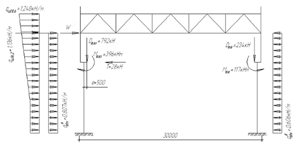 – Расчётная равномерно распределённая нагрузка на ригель рамы