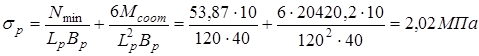 Rb = 0,75 кН/см2 для бетона В12 по т.1 Приложение 1(5) Принимаем Lр = 100 cм. Назначаем плиту в плане 400×1200 мм. Определяем толщину плиты. Вычисляем краевые напряжения в бетоне фундамента под опорной плитой