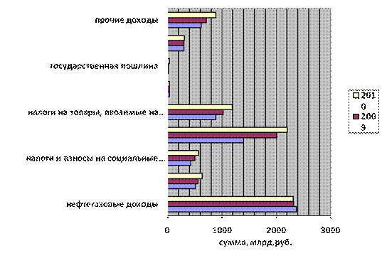 Рисунок 7. Доходы федерального бюджета Динамика доходов федерального бюджета характеризуется снижением с 22,3 % к ВВП в 2008 году до 15,0 % к ВВП в 2012 году. Наибольшее снижение отмечается в 2009 году по сравнению с 2008 годом: на 5,6 % к ВВП по доходам федерального бюджета на 2009 год, утвержденным Федеральным законом от 24 ноября 2008 г. № 204-ФЗ "О федеральном бюджете на 2009 год и на плановый период 2010 и 2011 годов" в действующей редакции (далее – Федеральный закон) и на 5,0 % к ВВП по уточненной оценке доходов федерального бюджета за 2009 год. При этом общая сумма доходов федерального бюджета за 2009 год по уточненной оценке, рассчитанная на основе показателей прогноза социально- экономического развития Российской Федерации на 2010 год и на плановый период 2011 и 2012 годов, представленного Министерством экономического развития Российской Федерации в сентябре т.г., составила 6 713,8 млрд. рублей, что соответствует общему объему доходов федерального бюджета, утвержденному Федеральным законом . В "Основных направлениях бюджетной и налоговой политики на 2009 и на период 2010-2012 годы" главный акцент сделан на задаче обеспечения сбалансированности и устойчивости бюджетной системы, усиление ее роли в стимулировании долгосрочного роста экономики и повышении уровня жизни населения, ускорения инновационного развития страны и формирования устойчивого механизма пенсионного обеспечения на длительную перспективу. В соответствии с бюджетной стратегией Минфина предусматривается, что расходы бюджетной системы в реальном исчислении (с учетом инфляции) будут возрастать, а их доля в ВВП будет сокращаться в среднем 0,18 % за год. В рамках бюджетной системы намечено увеличение роли региональных бюджетов с сокращением федеральной доли в расходах (на 0,25 % за год) . То есть в среднесрочном и долгосрочном плане предполагается сохранение существующей модели бюджетной политики, исходящей из необходимости сокращения доли государственных расходов в ВВП. Это обосновывается стремлением обеспечить сбалансированность бюджетной системы и поддержать темпы роста. Однако вызывает сомнение, что такой подход позволит в полной мере реализовать задачу коренной модернизации экономики и использовать такие факторы экономического роста, как стимулирование инвестиций и увеличение денежных доходов населения . Согласно данным ООН, в среднем расходы центральных правительств развитых государств составляют примерно 29% ВВП. В то же время доля расходов федерального бюджета Российской Федерации по отношению к ВВП примерно в два раза меньше этого уровня, составляя порядка 16% - 17% ВВП. Это существенно ослабляет роль федерального правительства России в перераспределении национальных ресурсов в соответствии с объявленными национальными приоритетами . В Бюджетном послании особо подчеркивалась задача повышения достоверности и надежности экономического прогнозирования, что должно минимизировать внесение многочисленных и часто значительных изменений в уже утвержденные бюджеты . Анализ проекта бюджета на 2009-2012 годы показывает, что прогнозные оценки исходных экономических показателей, на основе которых строится макроэкономический прогноз и ведётся расчет основных параметров бюджета, в целом ряде случаев нуждается в дополнительной аргументации. В частности, это касается прогнозных оценок темпов ро