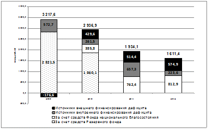 *- доходы от управления Фондом национального благосостояния в 2010-2002 годах подлежат зачислению в доходы федерального бюджета; ** - с учетом доходов от управления средствами Фонда национального благосостояния за 2012 год в объеме 14,0 млрд. рублей, поступающих до 1 февраля 2013 года При этом значительная часть средств Фонда национального благосостояния в объеме 655,0 млрд. руб. размещена на депозитах в ВЭБ . Таблица 3.9 Иные источники финансирования дефицита федерального бюджета в 2009-2012 годах (млрд. рублей)