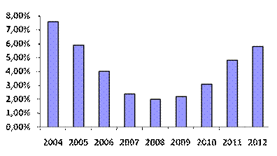 Рисунок 4. Источники финансирования дефицита федерального бюджета (млрд. рублей) После исчерпания средств Резервного фонда в 2010 году бюджетная политика будет в большей степени ориентирована на финансирование дефицита федерального бюджета с помощью государственных заимствований. Низкий уровень государственного долга позволяет проводить такую политику, не опасаясь за сохранение долговой устойчивости Российской Федерации. Несмотря на резкое ухудшение внешних условий экономического развития и серьезное бремя долговой нагрузки, приходящейся на корпоративный сектор, показатели долговой устойчивости Российской Федерации остаются одними из лучших в мире . Политика в области государственного долга Российской Федерации на 2010 – 2012 годы будет направлена на: - обеспечение сбалансированности федерального бюджета, при сохранении достигнутой в последние годы высокой степени долговой устойчивости; - развитие национального рынка государственных ценных бумаг; - активное использование инструмента выдачи государственных гарантий Российской Федерации . Ключевыми задачами в области государственных внутренних заимствований станут, повышение ликвидности рыночной части государственного внутреннего долга, выраженного в государственных ценных бумагах, и сохранение оптимальной дюрации (точка равновесия сроков дисконтированных платежей) и доходности на рынке государственных ценных бумаг. Программа государственных внутренних заимствований Российской Федерации на 2010 –2012 годы разрабатывается с учетом возможного спроса на государственные ценные бумаги со стороны различных категорий инвесторов и предусматривает значительное положительное сальдо заимствований на внутреннем рынке [11] . По оценке Минфина России, сальдо по государственным ценным бумагам составит: в 2010 году – 568,4 млрд. рублей, в 2011 году – 748,6 млрд. рублей и в 2012 году – 236,5 млрд. рублей. При этом в 2010 году привлечение составит 844,1 млрд. рублей при погашении 275,7 млрд. рублей, в 2011 году - соответственно 957,5 млрд. рублей и 208,9 млрд. рублей и в 2012 году - соответственно 755,4 млрд. рублей и 518,9 млрд. рублей . Минфин России для поддержания ликвидности рынка и в целях построения индикативной кривой доходности будет проводить размещение на рынке базовых выпусков со сроком обращения 3, 5 и 10 лет . В 2010 – 2012 годах показатели доходности по государственным ценным бумагам ожидаются на уровне, близком к сформировавшемуся в настоящее время. Возможный рост доходности по рублевым инструментам (по краткосрочным инструментам - до 9,5-10,5% и по среднесрочным и долгосрочным инструментам - до 11,0-11,5% и 11,5-12,0% соответственно) может быть вызван факторами, связанными с изменением курса рубля к иностранным валютам, изменением объемов валютных резервов, корректировкой цены на нефть и ростом процентных ставок на долговых рынках за рубежом [12] . Расходы на обслуживание государственного долга Российской Федерации составят в 2010 году 304,0 млрд. рублей, в 2011 году – 450,6 млрд. рублей и в 2012 году – 561,0 млрд. рублей. Доля расходов на обслуживание госдолга в расходах федерального бюджета увеличится при этом с 2,0% в 2009 году до 5,8% в 2012 году на рис. 5