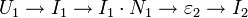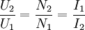 Де: U1 - миттєве значення напруги на кінцях первинної обмотки, N1 - число витків у первинній обмотці. Поділивши рівняння U2 на U1, отримаємо відношення:
