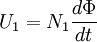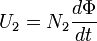 Де: U2 - Напруга на вторинній обмотці, N2 - число витків у вторинній обмотці, Φ - сумарний магнітний потік, через один виток обмотки. Якщо витки обмотки розташовані перпендикулярно лініям магнітного поля, то потік буде пропорційний магнітному полю B і площі S через яку він проходить. ЕРС, створювана в первинній обмотці, відповідно: