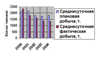 Рисунок 2.3 – Динамика среднесуточной добычи угля за период 2000-2004 г.г. Как видно из приведенного рисунка 2.1 самая низкая трудоемкость наблюдалась в 2000 году, она была значительно ниже запланированного уровня данного показателя. В цифровом выражении: 2046,29 человек на 1000 тонн добычи – фактически, против 2415,23 человек на 1000 тонн добычи плана. Затем намечается тенденция резкого повышения уровня трудоемкости. Именно период с 2000 до 2002 года включительно определяется, в значительной степени, роста рекордно высоких показателей трудоемкости для ш/у Бажанова. Это обусловлено в значительной степени ростом составляющих показателя с разной интенсивностью. Среднесуточная добыча в несколько раз быстрее изменяла свои численные значения, чем среднесписочная численность (смотри рисунки 2.2 и 2.3). Причем, уже с 2001 года показатель фактической трудоемкости перекрывает плановый уровень данного показателя. Помимо чисто экономических причин происшедшего, необходимо акцентировать внимание на то, что именно в конце 2000 года активизировалось забастовочное движение в угольной промышленности Украины. Так же если взглянуть на рисунок 2.3, то можно заметить, что шахтоуправление впервые не выполнило плана по среднесуточной добыче. Наиболее высокое значение трудоемкости наблюдалось в 2003 году по причине не пропорционального падения добычи и численности ППП по добыче ш/у «Бажанова». Однако, с начала 2004 года наметилась тенденция ее снижения по причине уменьшения темпов суточной добычи, однако численность персонала при этом все еще убывает. Поэтому, можно позволить себе предположение, что это снижение трудоемкости является временным. Анализируя, трудоемкость по процессам по добыче угля, прихожу к тому, что наиболее трудоемкими процессами на ш/у «Бажанова» являются очистные работы, подготовительные работы, содержание и ремонт и как это ни странно, работы на поверхности. Показатель трудоемкости на поверхности не отражает фактического положения вещей. Это объясняется тем, что штат сотрудников на поверхности чрезмерно «раздут» и необходимо проводить сокращение штатов на поверхности, в том числе и при данных прочих, отказываться от социальной сферы, которая висит «мертвым грузом» и не приносит ни какой прибыли производству. Сейчас на предприятии проводится программа по сокращению численности рабочих на поверхности, однако, вопрос о социальной сфере «повис в воздухе». 3. ОБОСНОВАНИЕ ПЛАНА ДОБЫЧИ КГЛЯ НА 2005 ГОД Поскольку показатели плановой и фактической трудоемкости работ по добыче угля в значительной степени зависят от объема среднесуточной добычи угля, что обусловлено наличием значительного удельного веса рабочих постоянного состава в общей их численности, в курсовом проекте необходимо обосновать возможный годовой (среднесуточный) план добычи. Обоснование проведем исходя из производственной возможности шахты на планируемый год по фактору «фронт горных работ» в предположении, что по другим факторам производственной мощности имеются значительные резервы. В качестве исходной информации для решения этой задачи будем использовать следующие плановые документы и программы развития горных работ на текущий год: - график ввода и выбытия лав; - расчет нормативных нагрузок на очистные забои, указанные в этом графике ввода и вывода лав. Возможная добыча с 