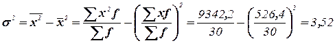 Вариант 2: расчет дисперсии по формуле Техника вычисления дисперсии сложна, а при больших значениях вариант и частот может быть громоздкой. Расчеты можно упростить, используя свойства дисперсии. Определить дисперсию в дискретном ряду распределения, используя следующую таблицу: Таблица 3.1.2. Вспомогательная таблица для решения первым вариантом.