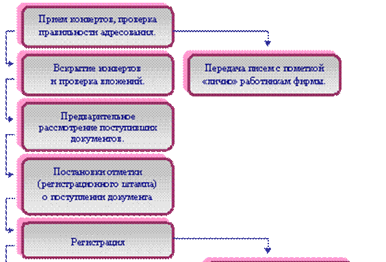 а) доставку и прием документов; б) первичную обработку документов; в) предварительное рассмотрение документов; г) рассмотрение документов руководством предприятия; д) передачу на исполнение должностным лицам (структурным подразделениям); е) осуществление контроля за исполнением документов; ж) прием исполненного документа, его помещение в дело; з) последующее хранение и работу с документами (до передачи их в архив или на уничтожение). Доставка документов на предприятие, как правило, осуществляется курьерами в почтовом отделении по месту расположения предприятия (за исключением документов, поступающих непосредственно на предприятие по техническим каналам связи). Прием входящей деловой корреспонденции от курьера производится уполномоченным сотрудником службы ДОУ. Последующая первичная обработка входящей деловой корреспонденции включает: - проверку целостности упаковки и вложений принятой корреспонденции; - проверку правильности ее адресования; - вскрытие конвертов (упаковки посылок, бандеролей). Конверты от поступающих документов (в том числе писем граждан) не уничтожаются в случаях, когда только по конверту можно определить адрес отправителя, время отправки и получения документа, а также при поступлении личных или доплатных документов. Документы с пометкой «лично» или адресованные общественным организациям при первичной обработке документов не вскрываются и передаются по назначению. При поступлении документов на магнитных и иных небумажных носителях первичной обработке подлежит сопроводительная документация, а носители передаются на машинную обработку без вскрытия упаковки; - распределение корреспонденции на регистрируемую и нерегистрируемую; - простановку штампов с отметкой «Входящий № __» на документах, подлежащих регистрации (учет документов); - заполнение регистрационных карточек (журналов, книг и т. п.) (регистрация документов). После этого зарегистрированная деловая корреспонденция передается на предварительное рассмотрение. Более подробно обработка входящих документов показана на рисунке 1.1. По результатам предварительного рассмотрения часть документов установленным порядком передается соответствующим должностным лицам (структурным подразделениям) предприятия. Другая их часть направляется через секретариат на рассмотрение руководителю предприятия для принятия и оформления (в виде резолюции) решения о порядке и сроках исполнения указанных документов. Следует отметить, что на рассмотрение руководства предприятия обычно передаются все документы, полученные от вышестоящих органов управления и (или) содержащие информацию по принципиальным вопросам деятельности предприятия, а потому требующие решения руководителя. Обработка и передача документов ответственным исполнителям должна осуществляться в день их поступления в службу ДОУ или в первый рабочий день (при поступлении документов в нерабочее время).