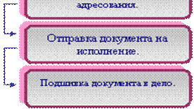 Рисунок 1.2 – Схема работы с исходящими документами Рассмотрим особенности работы с исходящими документами в соответствии с перечисленными этапами. Документы, поступающие в службу ДОУ для отправки, должны обрабатываться и отправляться в тот же день, но не позднее следующего рабочего дня. Указанная работа начинается с проверки правильности оформления и приема документов от ответственных исполнителей уполномоченными сотрудниками службы ДОУ. Документы, предназначенные для отправки, принимаются от ответственных исполнителей полностью оформленными (служба ДОУ не несет ответственности за содержание документа). Это означает, что исходящий документ должен: а) иметь все необходимые реквизиты, включая адресные данные; б) быть подписан (утвержден) соответствующим должностным лицом; в) иметь сопроводительный лист (письмо) при наличии приложений или в том случае, если документ исполнен (записан) на машинном носителе. Отправка документов на небумажных носителях производится в упаковке, соответствующей техническим требованиям и сохранности носителей и записанной на них информации. г) вне зависимости от количества адресов рассылки иметь контрольный экземпляр (в том числе на сопроводительный лист) для помещения последнего в дело; д) иметь опись (расчет) рассылки при направлении документа в четыре и более адресов; е) в необходимых случаях иметь отметку о категории почтового отправления (за исключением простых отправлений). Исходящие документы, оформленные с соблюдением перечисленных правил, передаются на регистрацию. Регистрация производится путем простановки штампа «Исходящий №__» и внесения справочных данных о документе в соответствующий журнал (книгу). Регистрации подлежат также все приложения к документу и сопроводительный лист (письмо). Зарегистрированные документы проходят процедуру сортировки документов по адресам назначения и видам почтовых отправлений, после чего передаются для подготовки к отправке. Недооформленные или неправильно оформленные документы подлежат возврату ответственному исполнителю для устранения недостатков, препятствующих отправке. Подготовка документов к отправке включает: - проставление на конвертах (наклейках на упаковке) адресных данных; - фальцовку (сложение путем перегиба) документов; - вложение документов в конверты (упаковки); - заклеивание и маркировку (снабжение знаками почтовой оплаты) конвертов. Для передачи подготовленных к отправке документов в экспедицию уполномоченными сотрудниками службы ДОУ предварительно составляются описи (реестры) на подлежащую отправке обычную и заказную деловую корреспонденцию. Принятая по описи деловая корреспонденция упаковывается сотрудниками экспедиции в транспортировочную тару (ящики, короба, портфели и пр.), после чего доставляется в почтовое отделение установленным порядком (пешком или на автомашине). После отправки деловой корреспонденции сотрудники отдела делопроизводства помещают контрольные экземпляры исходящих документов в дела в соответствии с утвержденной номенклатурой дел. Последующее хранение и работа с контрольными экземплярами исходящих документов до передачи их в архив или на уничтожение производятся исходя из практической потребности в документах и с учетом их исторической (научной и иной) ценности.Работа с внутренн