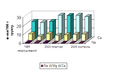 Рис. 4.7. Вміст увібраних катіонів в орному шарі темно-каштанових слабосолонцюватих ґрунтів, зрошуваних прісною водою Зрошення підсилює біохімічні процеси, в результаті чого збільшується кількість вуглецю. У зв’язку з цим карбонат кальцію з інертної форми переходить до розчинної, що проявляється у збільшенні активності іонів кальцію [14,60,102,121,183,184,205]. Підвищена активність його зберігається протягом тривалого періоду післядії. Така висока активність іонів кальцію в плантажованих ґрунтах свідчить про високу їх буферність до процесів осолонцювання. Натомість активність іонів натрію зменшується з роками як в плантажованих так і в неплантажованих ґрунтах. За рахунок цього відношення Таблиця 4.6 Зміни активності натрію та кальцію в темно – каштанових слабосолонцюватих ґрунтах, зрошуваних прісною водою
