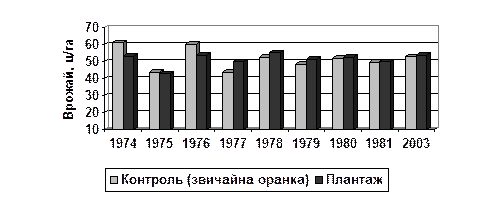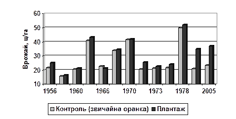 Рис. 5.2. Вплив меліоративної плантажної оранки на урожайність зернових культур на темно-каштанових слабосолонцюватих ґрунтах в умовах зрошення прісною водою. При зрошенні мінералізованими водами ефективність плантажної оранки виявилася дещо нижчою (рис.5.3) [95]. У перші три роки прирости врожаїв озимої пшениці були відсутні, очевидно, через збіднення орного шару на органічну речовину, пов’язані з нею рухомі форми поживних елементів та прояв в таких умовах токсичного впливу натрію зрошувальних вод на розвиток рослин. Вирівнювання цих показників у наступні роки а також покращені агрофізичні властивості ґрунтів плантажованого варіанту обумовили прибавку на рівні 3,3-5,9 %. На 30-й рік післядії на плантажованій ділянці урожайність озимої пшениці була вищою, ніж на контролі.