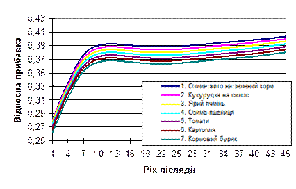 де, YM , Ai , ai , bi - параметри моделі, що розраховуються методами нелінійного програмування за критерієм мінімуму залишкової дисперсії; Y – прогнозний урожай; YM – максимально можливий урожай при фактичних погодних умовах та рівнях родючості грунту; Ai – складова частина максимального врожаю, яка формується завдяки і-того виду показника; ai – початковий рівень і-го показника, що впливає на урожай; bi – оптимальний рівень і-того показника, який забезпечує максимальний врожай; хі - фактичний рівень і-того показника m – кількість показників. Кінцевий вигляд моделі родючості плантажованих солонцевих ґрунтів є результатом багатофакторного кореляційно-регресійного аналізу. До моделі було залучено лише ті показники, які мають найвагоміший вплив на величину врожаю, саме ті які було виділено в результаті факторного аналізу. На основі отриманої моделі зв’язку продуктивності плантажованих ґрунтів солонцевих ґрунтів з кліматичними та ґрунтовими властивостям було побудовано графік. (рис. 5.4). Як видно з рисунку, стадійність змін основних ґрунтових властивостей чітко відображається на формуванні величини врожаю. Найбільші прибавки врожаю простежуються перші 15-20 років післядії, що відповідає найбільшій інтенсивності змін основних властивостей досліджуваних ґрунтів. У подальшому відбувається деяка стабілізація основних властивостей, і , як наслідок, стабілізація прибавок урожаю. Поступове зростання врожайності основних сільськогосподарських культур на 25-30 рік вказує на утворення нових ґрунтів, що забезпечують стабільну прибавку врожаїв сільськогосподарських культур. Розроблена модель дозволяє прогнозувати врожайність основних сільськогосподарських культур на плантажованих ґрунтах півдня України та визначати динаміку змін впливу окремих показників.
