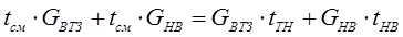 где tсм - температура смешанного воздуха, tТН – температура теплоносителя (вода), tНВ – температура наружного воздуха, GВТЗ – массовый расход воздуха ВТЗ, GНВ – массовый расход наружного воздуха. Из уравнения теплового баланса tсм вычисляется по формуле:
