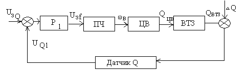QВТЗ UQ 1 Рис.2.13 Структурная схема датчика расхода воздуха 2.2.6 Математическая модель САУ ВТЗПри регулировании производительности вентилятора объектом управления (ОУ) является воздушно-тепловая завеса, регулируемой величиной – расход воздуха, регулирующим воздействием – частота вращения электродвигателя. По рассмотренным выше математическим моделям звеньев, входящих в систему управления воздушно-тепловой завесой, составлена структурная схема (рис.2.14).