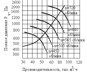 Рис. 2.6 Аэродинамическая характеристика вентилятора ВЦ-4-76-16. Производительность вентилятора составляет 70000 м3 /ч или 19,4 м3 /с. Частота вращения вала вентилятора - 720 об/мин. или 75,36 рад/сек., мощность приводного асинхронного двигателя вентилятора составляет 37 кВт. Вентилятор нагнетает наружный атмосферный воздух в тепловую завесу. В результате теплообмена воздуха с горячей водой, пропускаемой через трубки теплообменника ВТЗ, происходит нагрев проходящего воздуха. Рассмотрим схему регулирования режима работы вентилятора ВЦ4-76 №16. На рис. 2.7 приведена функциональная схема вентиляторного агрегата при регулировании частотой вращения.