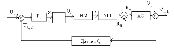 2.3 Описание элементов САУ УШ, взаимодействие элементов в системеСистема автоматического управления шиберами содержит следующие элементы: регулятор (Р2 ), исполнительный механизм (ИМ) с бесконтактным реверсивным пускателем (ПБР), управляемые шиберы (УШ), аэродинамический объект, датчик расхода воздуха. Регулятор (Р2 ) по сигналу задания требуемого угла наклона шиберов Uзα и сигналу обратной связи с датчика UQ 2 подает команду на ПБР на включение ИМ вперед или назад. ПБР формирует сигнал управления UУ исполнительным механизмом. ИМ изменяет угол α поворота шиберов. При этом в тоннеле изменяется расход воздуха QНВ , который контролируется датчиком расхода воздуха. На рис.2.15 представлена функциональная схема САУ УШ.
