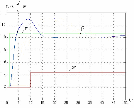 Рис.3.4. Переходный процесс в замкнутой системе без регулятора с переменным возмущающим воздействием