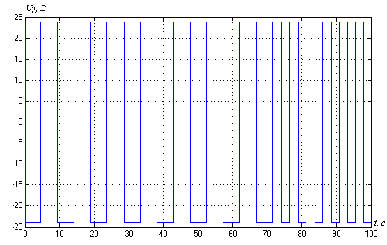 Подставляя известные параметры в (3.30), определяем Таким образом, найденные параметры автоколебаний соответствуют значениям, рассчитанным выше, т.е. устойчивым автоколебаниям. 3.2.5 Численное моделирование переходных процессов в системе по управляющему и возмущающему воздействиямВ пакете MatLab6.5 проведено моделирование процессов замкнутой системы с дифференцирующим фильтром 2-го порядка (рис.3.21) при m=2.12 с. и d=0.707. Результаты моделирования переходных процессов по управляющему воздействию представлены на рис.3.23 - 3.25. Рис.3.23. Графики управляющего Uy воздействи я