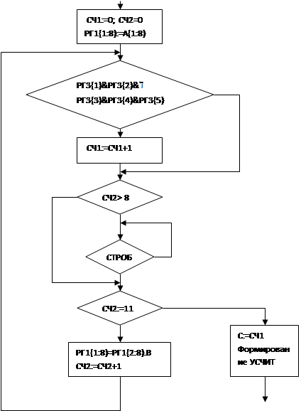 | МОСКОВКИЙ АВИАЦИОННЫЙ ИНСТИТУТ (государственный технический университет) Кафедра 403 РАСЧЕТНО-ПОЯСНИТЕЛЬНАЯ ЗАПИСКА к курсовой работе по дисциплине «Вычислительные системы и микропроцессорная техника» Выполнил студент группы 04-512 Гуреев И.А. Консультировал Мальшаков Г.В. 2010 г. ОГЛАВЛЕНИЕ 1. Уточнение задания …………………………………………………………3 2. Разработка схемы алгоритма и составление операционного описания….5 3. Построение функциональной схемы операционного автомата…………..7 4. Управляющий автомат с жесткой логикой………………………………....8 5. Управляющий автомат с программируемой логикой……………………..12 6. Функциональная схема автомата с программируемой логикой………….15 7. Построение принципиальной схемы……………………………………….16 8. Временные диаграммы………………………………………………………17 9. Список литературы…………………………………………………………..18 ЗАДАНИЕ По шинам А{1:8} и В на вход устройства поступает 16-ти разрядный код по байтам (первый байт по шине А параллельно, второй по шине В последовательно). Определить число комбинаций 11011 в пришедшем коде, результат выдав по отдельной шине С. УТОЧНЕНИЕ ЗАДАНИЯ 1. Примем, что источник входного кода гарантирует правильность выставленной информации во время действия стробирующего импульса СТРОБ, а само устройство подтверждает выдачу кода числа единичных символов генерацией импульса считывания УСЧИТ. Выберем тактовую синхронизирующую последовательность импульсов. Пусть в разрабатываемом устройстве она будет общей для источника, устройства преобразования и потребителя информации (внешняя синхронизация). Пусть частота ГТИ равна 5 МГц. Будем считать, что смена кодов А, В и С осуществляется по положительному фронту импульсов ГТИ, длительность импульсов СТРОБ и УСЧИТ равна длительности импульсов тактовой последовательности, а положительные фронты этих импульсов появляются вслед за положительным фронтом импульсов ГТИ. 2. Определим разрядность выходного кода. Максимальное число возможных последовательностей 11011 в 16-ти разрядном коде равно 11, следовательно, оно потребует формирования на выходной шине 4-х разрядного кода. 3. Входные данные, приходящие по шинам A {1:8} и B , сопровождаются управляющими сигналами СТРОБ (передний фронт сигнала СТРОБ совпадает с установившимся сигналом на шинах A и B ).